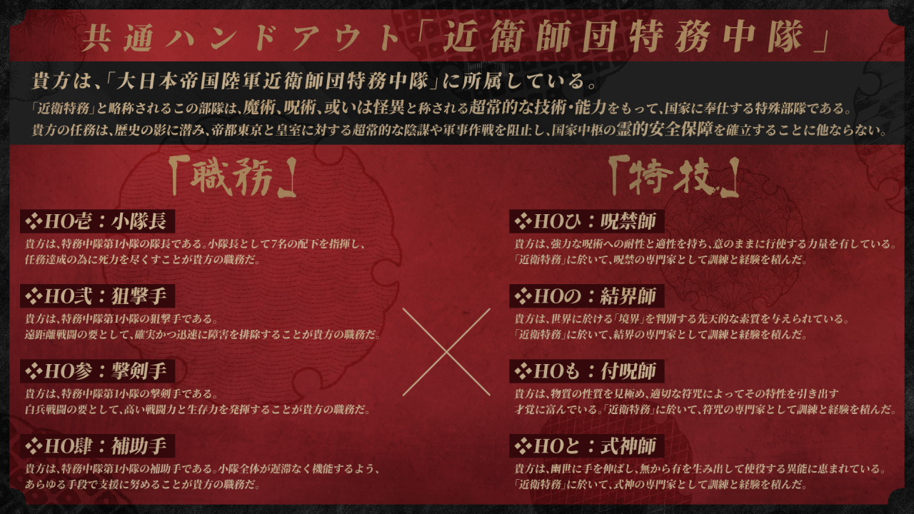 本項に記された呪文群は、特務中隊の前身の一つである陰陽寮が連綿と保全してきた呪術をベースに、