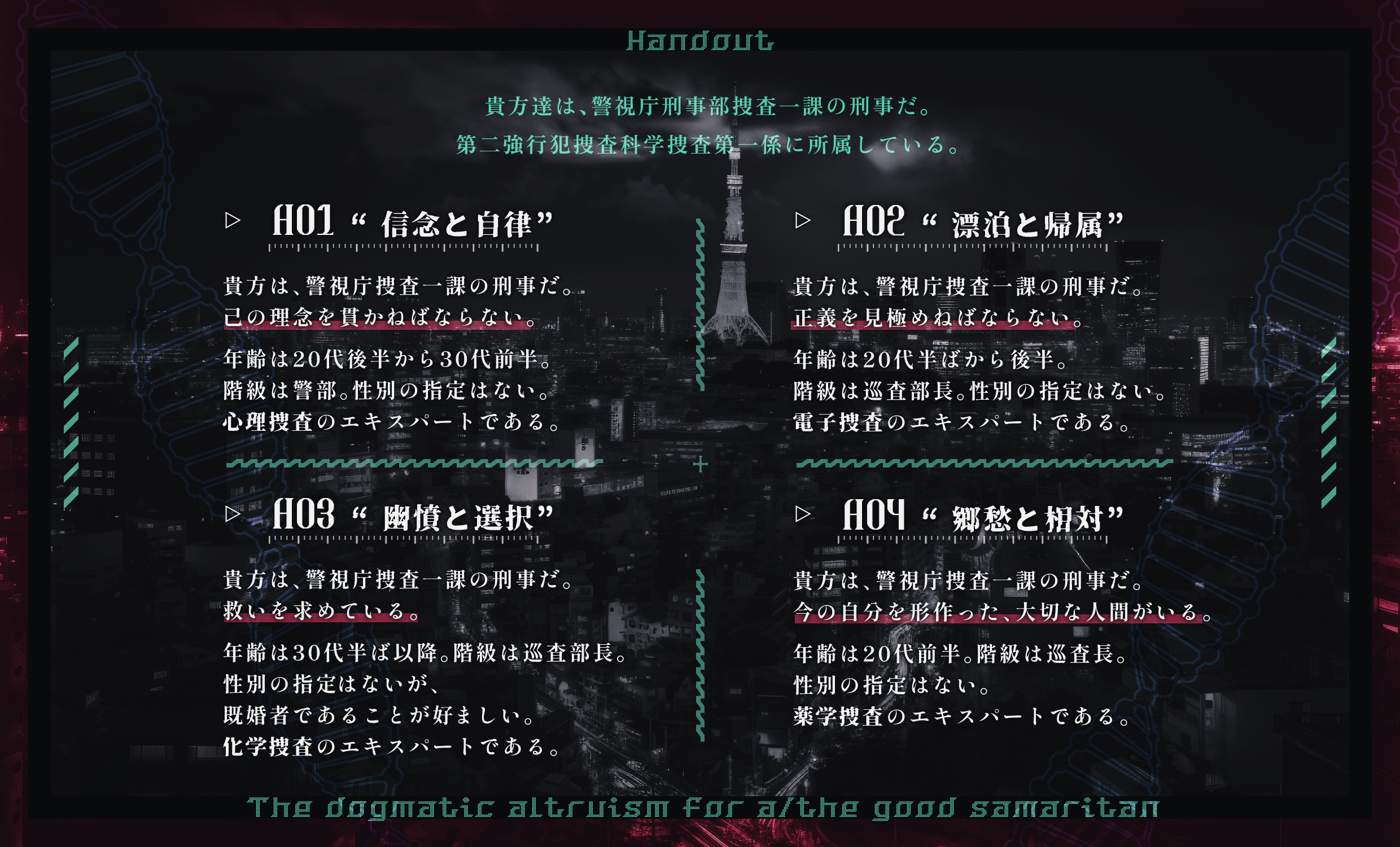 班長はHO3、副班長はHO4。その他、シナリオ内では黒子となる一般の巡査/巡査部長が2名。