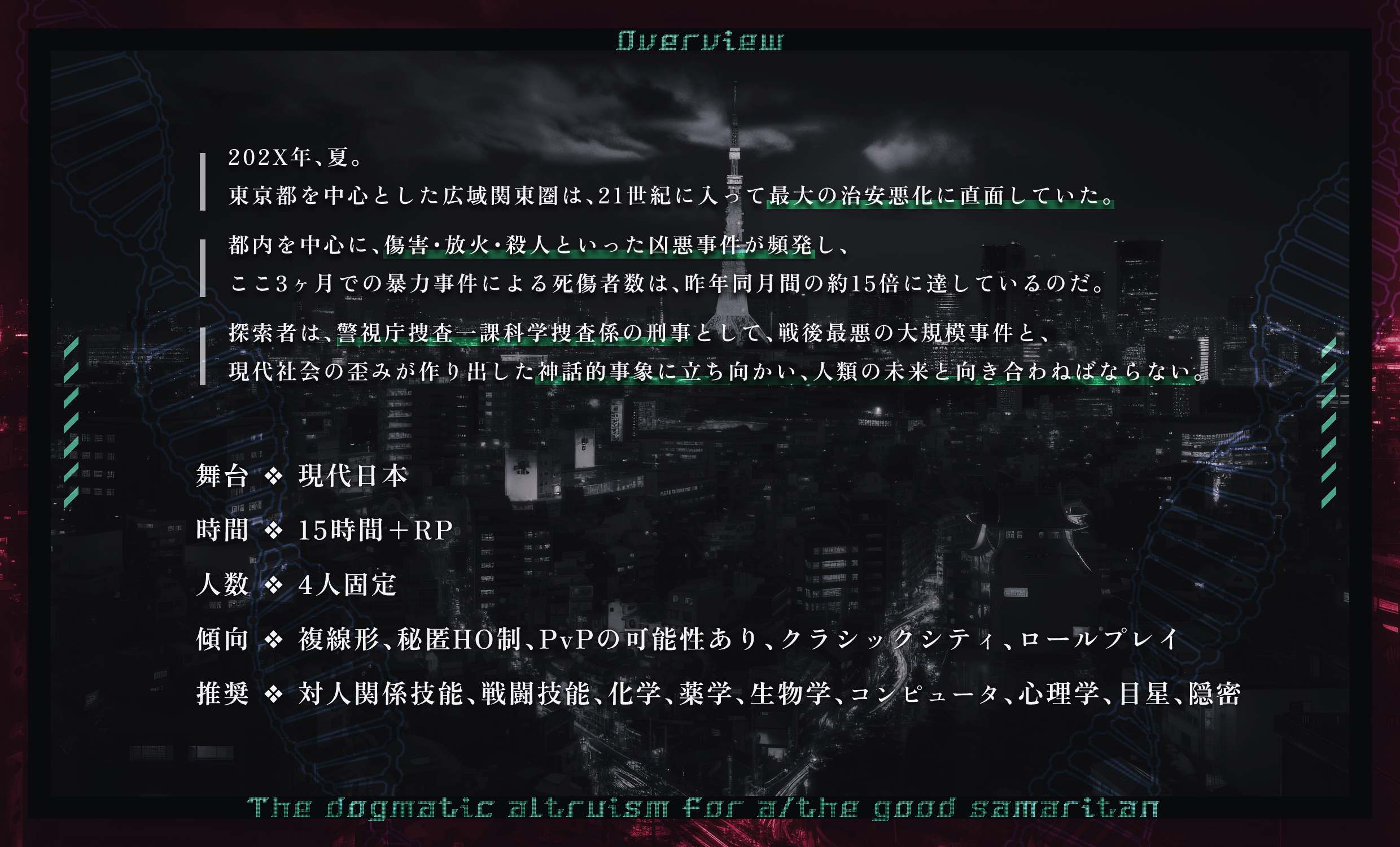 現在、東京都を中心とした広域関東圏は、21 世紀に入って最大の治安悪化に直面している。約3 ヶ月前から、都内を中心に、傷害・放火・殺人といった凶悪事件が頻発するようになっているのだ。警視庁を中心に、広域関東圏の各県警は緊密な連携体制を構築し、事態の収拾に当たっているが、状況が好転する見込みは依然として見えず、ここ3 ヶ月での暴力事件による死傷者数は、昨年同月間の約15 倍となっている。