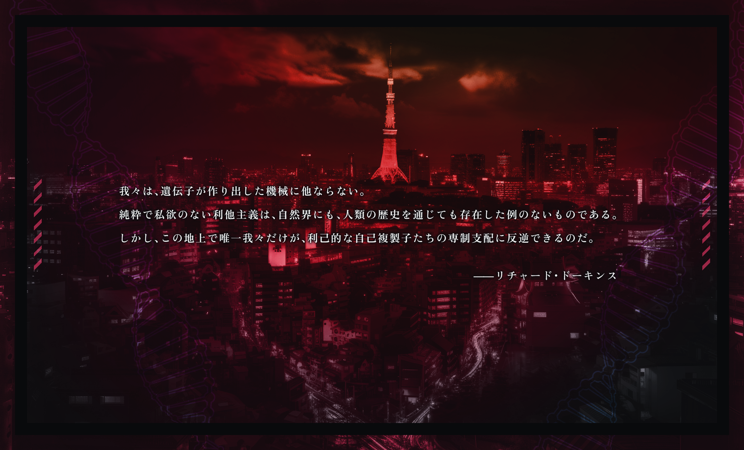 "我々は、遺伝子が作り出した機械に他ならない。 純粋で私欲のない利他主義は、自然界にも、人類の歴史を通じても存在した例のないものである。 しかし、この地上で唯一我々だけが、利己的な自己複製子たちの専制支配に反逆できるのだ。"
